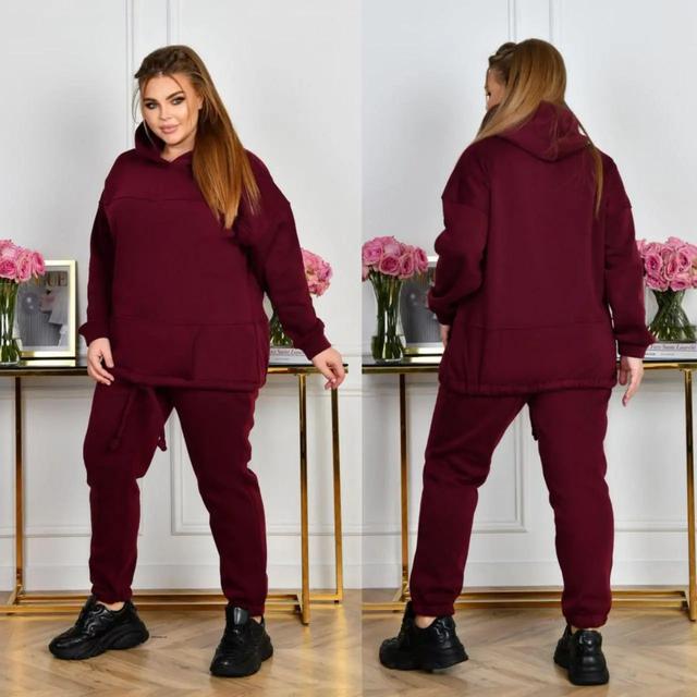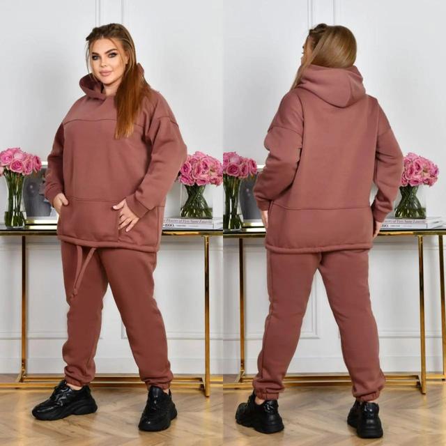 Теплий і зручний костюм на щодень. Виконаний із трикотажної тринитки з начосом середньої щільності. Вільне худі з капюшоном на підкладці, кишенею-кенгуру та куліскою по низу. Опущена лінія плеча додає комфорту. Штани прямого крою із завищеною посадкою, поясом на резинці та манжетами знизу. Бокові кишені роблять образ практичним.